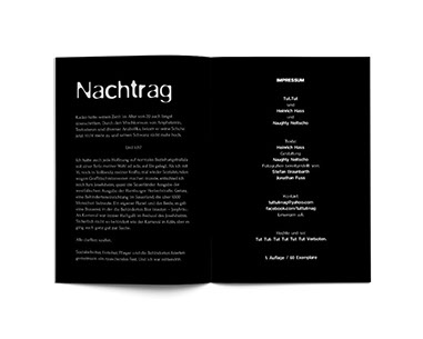 Das Tut-Tut-Mag aus Köln am Ring ist wohl am ehesten in die Sparte Literatur-Fanzine einzuordnen. Ein Typ namens Neitscho, Naughty Neitscho hat hier die autobiographischen Texte von einem anderen Typen, der sich Heinrich Hass nennt, grafisch in Szene gesetzt. Worüber Heinrich Hass am liebsten schreibt ist schnell abgerissen wie das Bändchen der Vorhaut, wenn man nicht aufpasst. Mackermäßige Bumsstorys die mit so viel Amphetamin im Balg in den seltensten Fällen zum Happy End kommen und weniger aufgeblasen mit mehr Mut zum Eingeständnis der eigenen Armseligkeit glaubwürdiger und sympathischer wären, aber wobei Letzteres ja wahrscheinlich gar nicht erwünscht ist. Schade eigentlich, denn schreiben kann Heinrich Hass, auch so, dass man es gerne liest. Nur eben die, irgendwie dümmlich erscheinende, Frauenverachtung geht mir auf den Sack. Ergo – 24 Seiten, etwas kleiner als A5, schon arrangiert mir ein paar künstlerisch gestalteten Bildern vom Autor z. B. mir runtergelassener Hose und Orangen, dem Wort Nutte mir tollem Font ganz groß geschrieben über zwei Seiten für vier Euro. Haltet euch ran, es gibt nur 60 Stück.